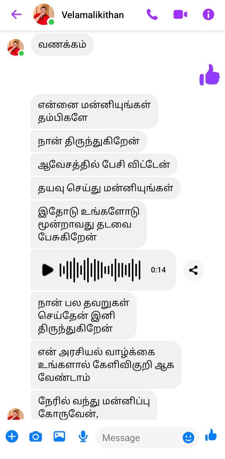 எம்மிடம் மன்னிப்பு கோருவதாக வேழமாலிகிதன் கூறுகிறார். ஆனால் மக்கள் உங்கள் திருட்டுகளை வெளிப்படுத்தச் சொல்கிறார்கள்